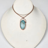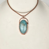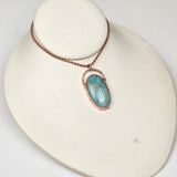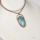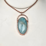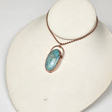 This handmade pendant features a polished Amazonite crystal in an elegant oval shape, surrounded by a rustic electroplated copper halo that adds depth, texture, and a touch of vintage charm. The gentle blue-green tones of Amazonite are beautifully framed by the warm, earthy copper, creating a piece that feels both soothing and empowering.