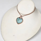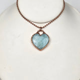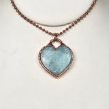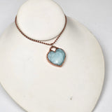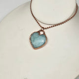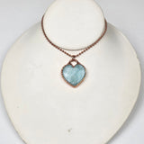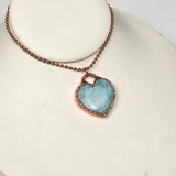 This beautiful pendant features a polished Amazonite crystal carved into a soft heart shape, then electroplated in pure copper to create a warm, protective finish. The serene blue-green hues of Amazonite shimmer gently beneath the copper edge, offering a peaceful and empowering piece that speaks directly to the heart.