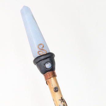 Embark on a journey of tranquility and cosmic connection with our Handmade Wood Wand, a unique creation infused with artistic flair and spiritual resonance. Crafted with care, this wand features a 2-inch Angelite point, known for fostering inner peace and enhancing communication.