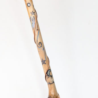 Adorned with delicate wire accents, Rainbow Moonstone, and Topaz gemstones, each chosen for their mystical properties, the wand exudes a harmonious balance of energy and intention. A universe-themed pyrography art design graces the wood, meticulously detailed and accentuated with watercolor accents that evoke the cosmos' serene beauty.