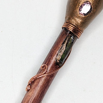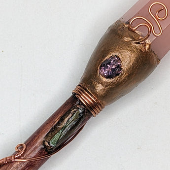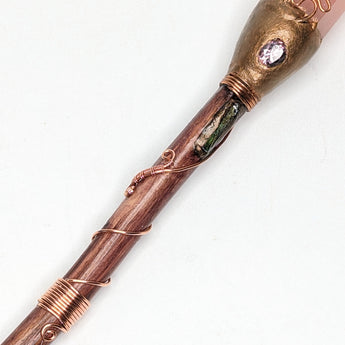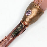 Bring balance and peace to your life with the Ascension Heart Chakra Wand! Handcrafted with personally sourced tree branches and beautiful copper accents, this powerful wand is accented with Rose Quartz, Pink Cubic Zirconia and Vivianite crystals to open and energize your heart chakra. Enhance your spiritually and emotional well being today!