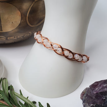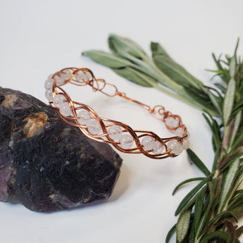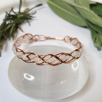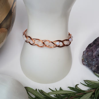 Handmade Rainbow Moonstone & Copper wire wrapped gemstone bracelet. A beautiful double gem weave around the entire bracelet. Made with high quality blue flash moonstone beads.