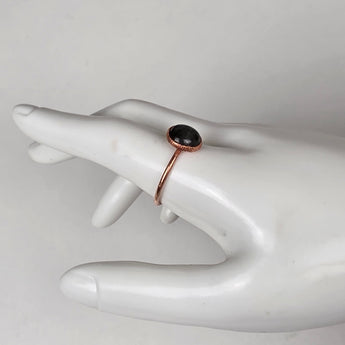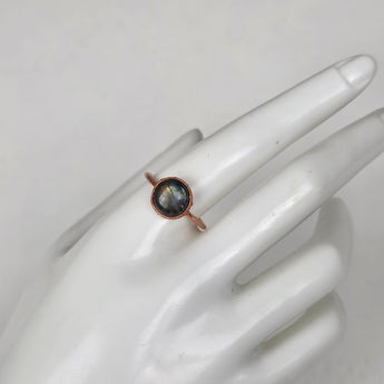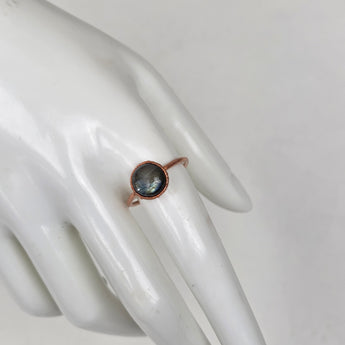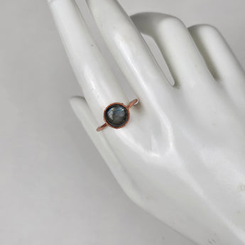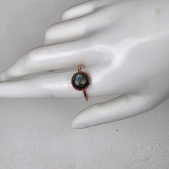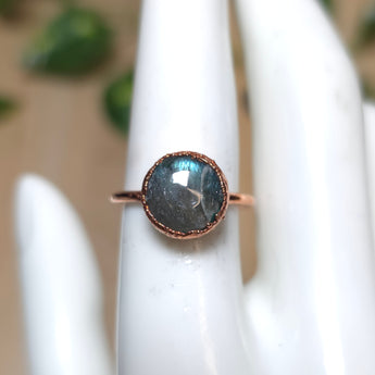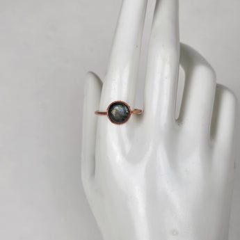 Each ring is made to order and a new crystal is used. The natural flash of the labradorite will vary with each ring.