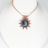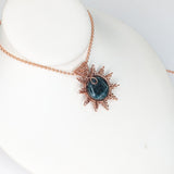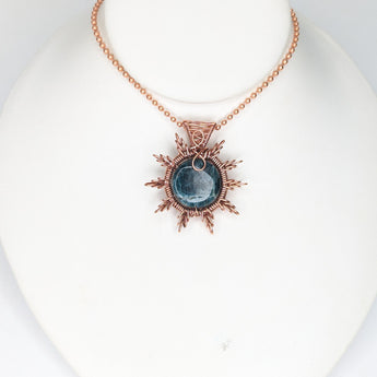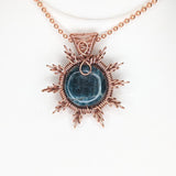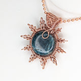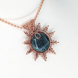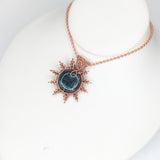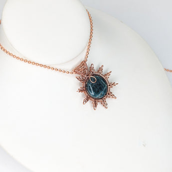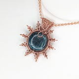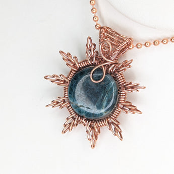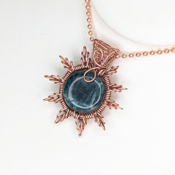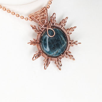 The Green Apatite Sun Pendant, meticulously handcrafted with pure copper wire, embodies a unique blend of natural beauty and artisanal craftsmanship. This exquisite piece captures the essence of the sun, symbolizing warmth, growth, and vitality, while the green apatite stone at its heart adds a touch of earthy elegance and the promise of emotional balance and renewal. The choice of green apatite, known for its connection to nature and ability to stimulate creativity and learning, makes this pendant not just a piece of jewelry but a token of personal growth and inspiration.