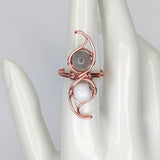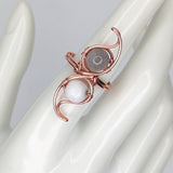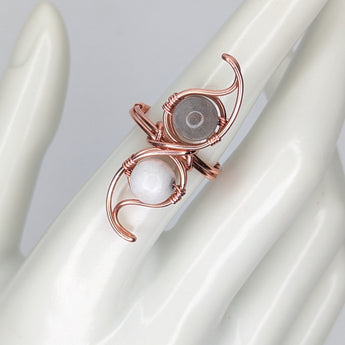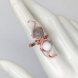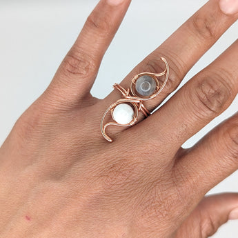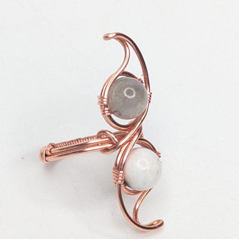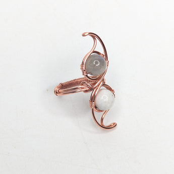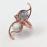 Expertly crafted by hand, this Reflections ring features a dazzling combination of Labradorite and Moonstone Crystal, both wire wrapped in 18 gauge pure copper. The result is a unique and stunning piece that will add a touch of natural beauty to any outfit.