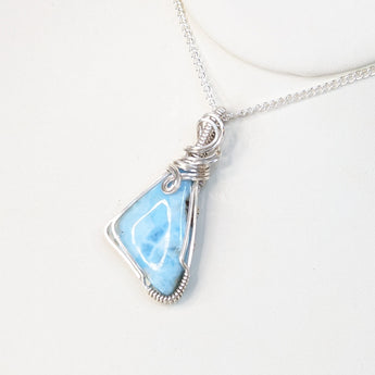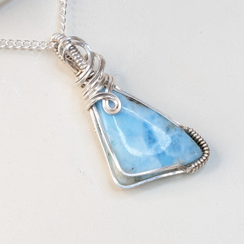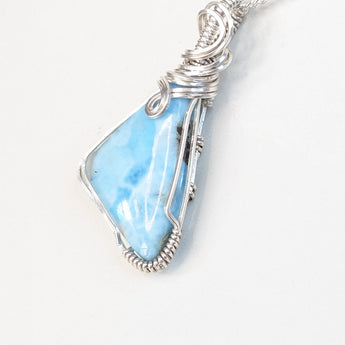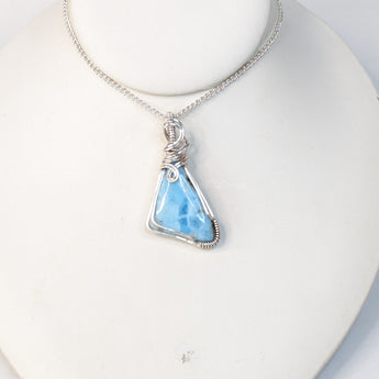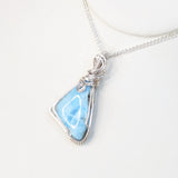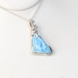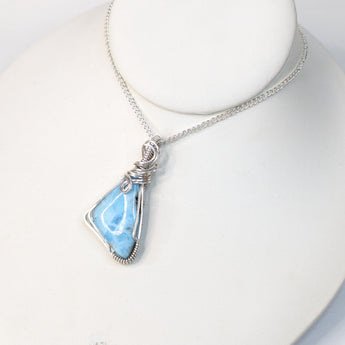 This hand wrapped pendant showcases a stunning blue Larimar stone in a minimalist design. Perfect for adding a touch of elegance and sophistication to any outfit.