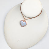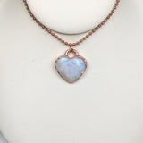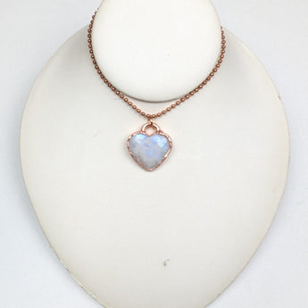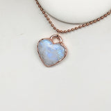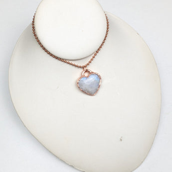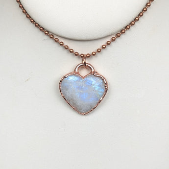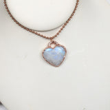 This enchanting pendant features a polished Rainbow Moonstone cut into a soft heart shape, lovingly electroplated in pure copper to highlight the stoneโs luminous flash and ethereal beauty. The heart shape adds a romantic and soulful touch, perfect for those drawn to divine feminine energy and emotional connection.