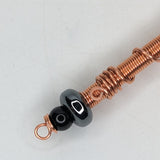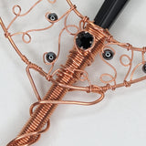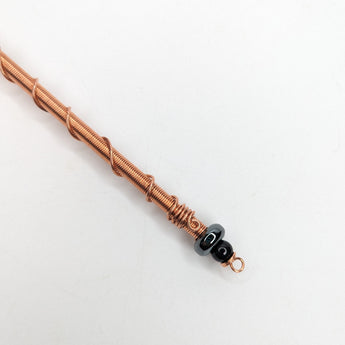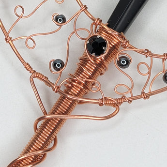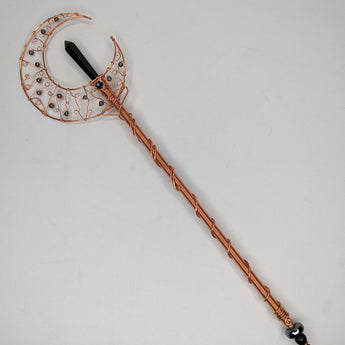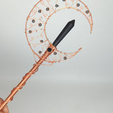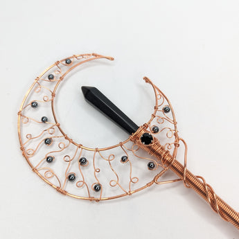 Crafted with precision and expertise, our Designer Obsidian Crescent Moon Wand in Copper boasts a crescent moon crystal design. Handmade with Pure Copper wire and accented with hematite, black crystal, and Obsidian, this wand offers grounding properties and amplifies energy. Channel your inner spirituality with this unique wand.