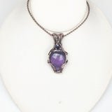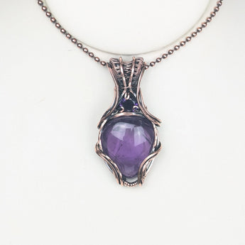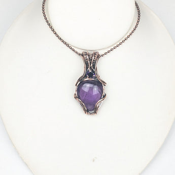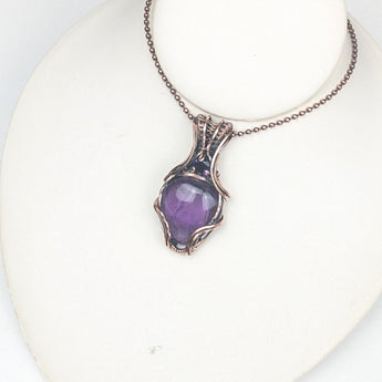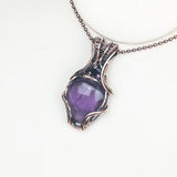 Crafted by hand, this copper amethyst pendant features a stunning amethyst tear drop Cabochon and an 8mm faceted gemstone.
