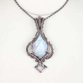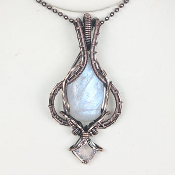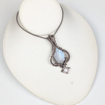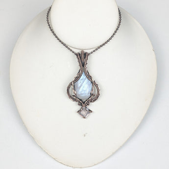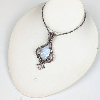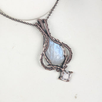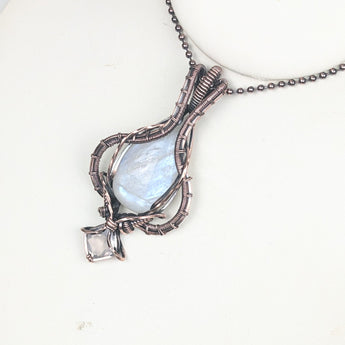 Expertly crafted from copper, this ethereal pendant showcases a 10mm square rose quartz and a large, radiant rainbow moonstone. Handmade with care, this pendant exudes natural beauty and positive energy, making it the perfect accessory for any occasion.