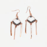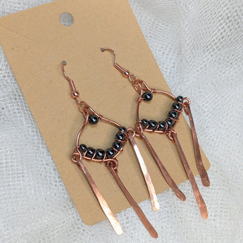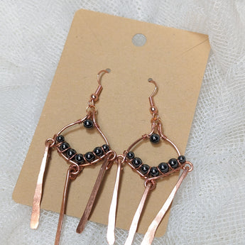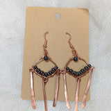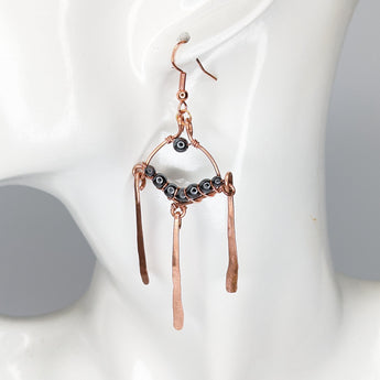 These handcrafted Obsidian Hammered Dangle Copper Earrings are perfect for adding subtle style to any outfit. The copper creates a warm hue against the black obsidian stone, and the hammered design symbolizes strength and durability. Wear these earrings to add a touch of elegant glamour to your look.