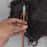 Every hand-crafted hair stick is coiled with pure bare copper wire and showcases a crystal point. Resin is applied for secure hold and to prevent hair from getting caught.