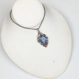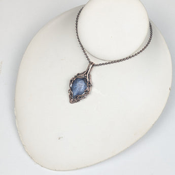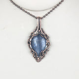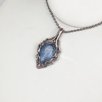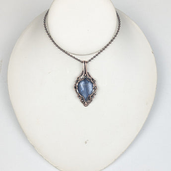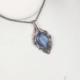 This stunning blue Kyanite crystal is wire-wrapped in pure bare copper, featuring an intricate filigree design with flowing swirls. The rich blue hues of the Kyanite are beautifully highlighted by the warm copper, creating a piece that exudes elegance and spiritual energy. Perfect for enhancing communication, intuition, and connection to higher realms.