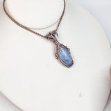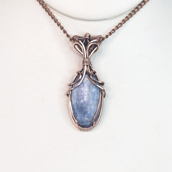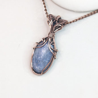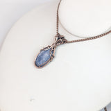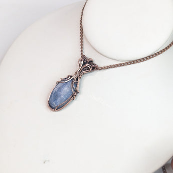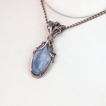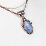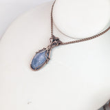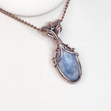 This elegant pendant features a handwrapped design, showcasing the unique beauty of kyanite and London blue topaz gemstones. The use of pure copper wire adds a touch of artisanal craftsmanship.