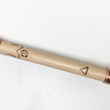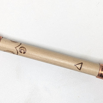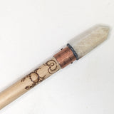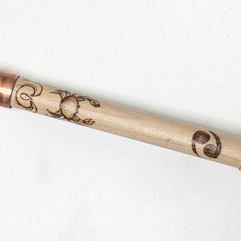 This design features a Cancer themed wood burned design. Design is accented with an 8mm Rainbow Moonstone and Moonstone Point.