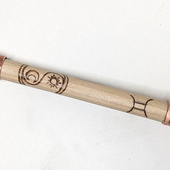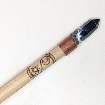 This design features a Gemini themed wood burned design. Design is accented with an 6mm Blue Lace Agate and Sodalite point