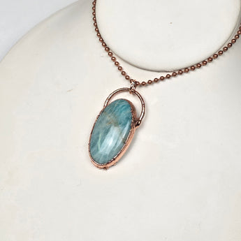 This handmade pendant features a polished Amazonite crystal in an elegant oval shape, surrounded by a rustic electroplated copper halo that adds depth, texture, and a touch of vintage charm. The gentle blue-green tones of Amazonite are beautifully framed by the warm, earthy copper, creating a piece that feels both soothing and empowering.