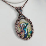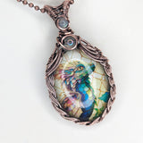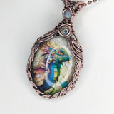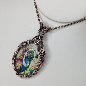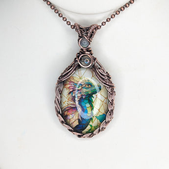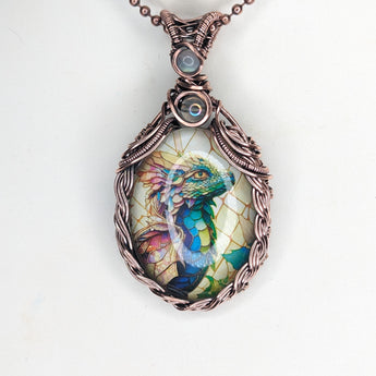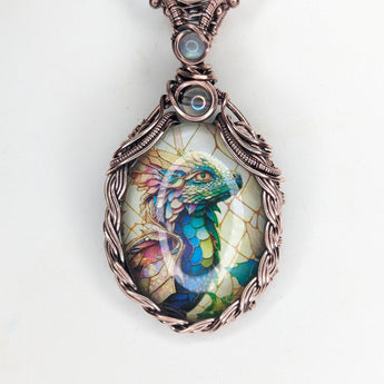 Elevate your style with our handmade Braided Baby dragon Pendant. Expertly crafted with braided copper wire, this pendant radiates uniqueness. Adorned with Rainbow quartz and Rainbow Moonstone accents.