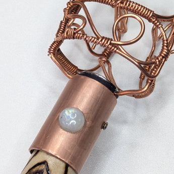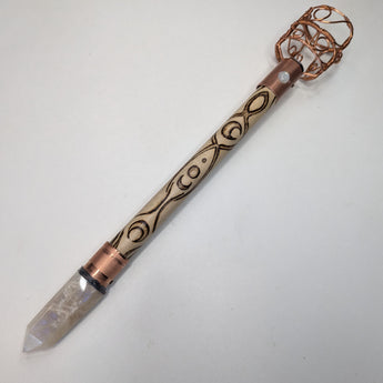 This design features a Sun themed wood burned design accented with a Sunstone Cabochon and Fire Quartz Point