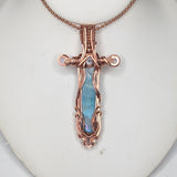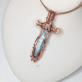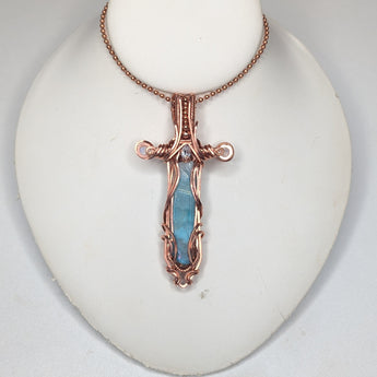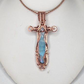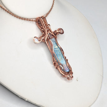 This striking handmade wire-wrapped copper Sword pendant symbolizes strength, clarity, and inner power. The sword design exudes a sense of courage and protection, while the carefully selected crystals amplify its energy. Aqua Aura Quartz brings purity and spiritual connection, Rainbow Moonstone enhances intuition and emotional healing, and quality Cubic Zirconia adds a touch of brilliance and clarity. The combination of these elements in this stunning piece promotes balance, spiritual growth, and a deeper connection to your inner strength. A truly powerful pendant for those seeking to wield their personal power with grace and confidence.