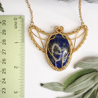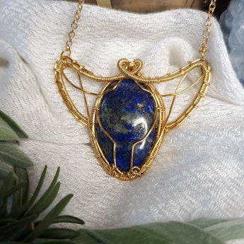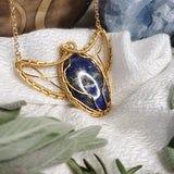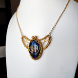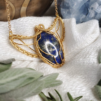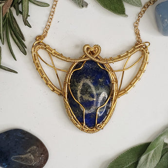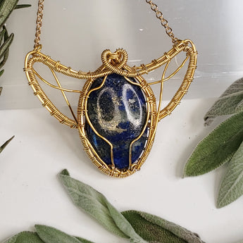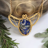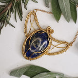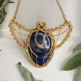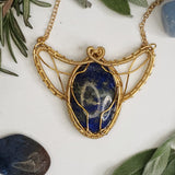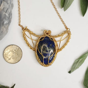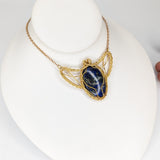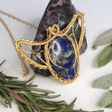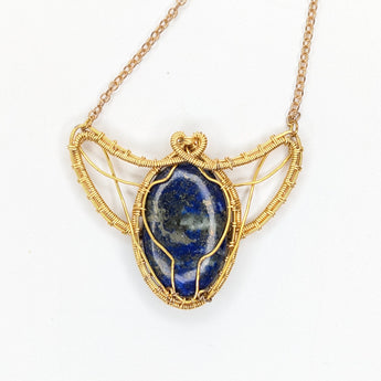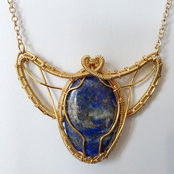Scarab inspired lapis lazuli wire wrapped pendant in gold plated wire
