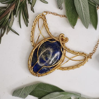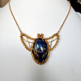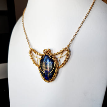 Wrap yourself in luxury with this decadent gold-plated wire-wrapped pendant featuring a majestic scarab inspired lapis lazuli. Step out in effortless style for any occasion! Add some pizzazz to your life!
