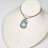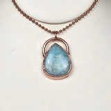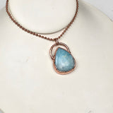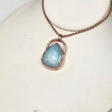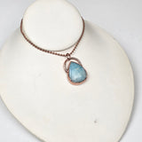 This serene pendant features a polished Hemimorphite crystal in a classic teardrop shape, beautifully electroplated in pure copper to accentuate its soft aqua-blue hues and gentle energy. The blend of luminous stone and warm copper creates a calming, organic look—perfect for those who value both style and spiritual significance.