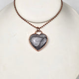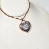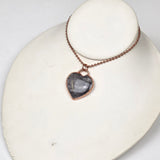 This powerful pendant features a polished Silver Sheen Obsidian crystal, shaped and smoothed to highlight its shimmering, metallic luster. The stone is electroplated in pure copper, adding a warm contrast to its cool, silvery glow. With every shift in light, the obsidian reveals hidden flashes—reminding us of the strength and wisdom found within our own shadows.