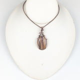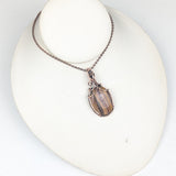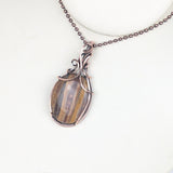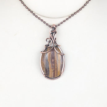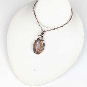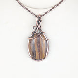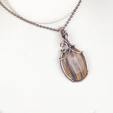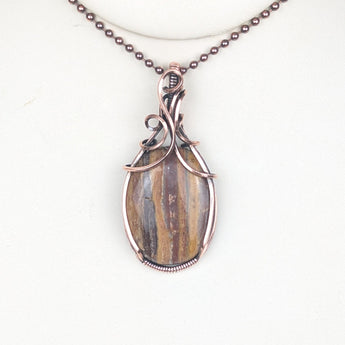 This handmade pendant features a stunning mookaite stone, elegantly wire wrapped with pure bare copper wire. The warm and earthy tones of the stone combined with the rustic copper create a unique and natural accessory. Perfect for adding a touch of bohemian charm to any outfit.