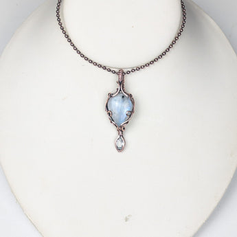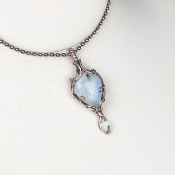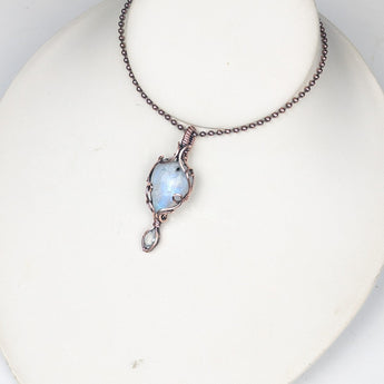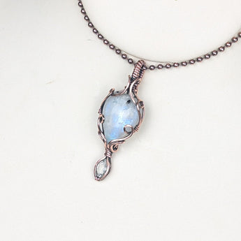 This stunning rainbow moonstone pendant features captivating flashes of color, from soft blues to iridescent whites. It’s wire-wrapped in pure copper with a minimalist design, showcasing flowing, delicate wires that highlight the stone's natural beauty. A simple yet elegant piece, perfect for those seeking a subtle touch of magic and balance.