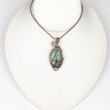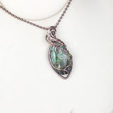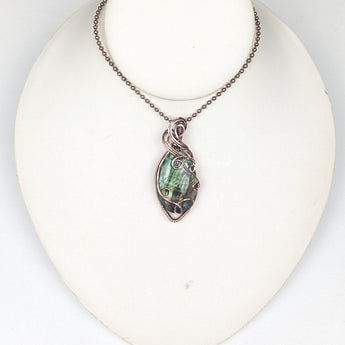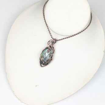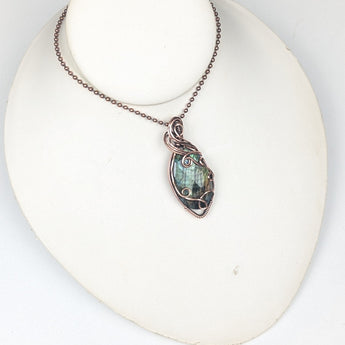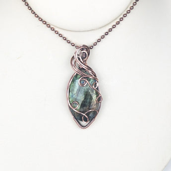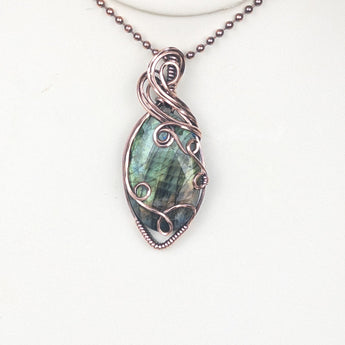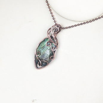 This beautiful faceted oval Labradorite features vibrant flashes of green, yellow, and orange, captured in a sleek wire wrap of pure copper. The simple yet elegant design of flowing copper and delicate swirls complements the stone's natural iridescence, creating a striking, minimalist piece that lets the Labradorite’s colors shine.