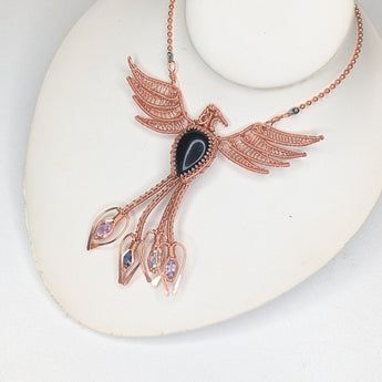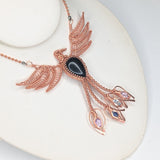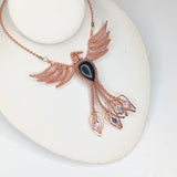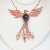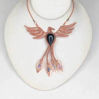 This exquisite handmade wire-wrapped copper Phoenix pendant embodies the spirit of rebirth, strength, and transformation. Crafted with intricate wirework, the pendant features powerful crystals that enhance its symbolic meaning. Black Agate offers grounding and protection, Amethyst provides spiritual insight and tranquility, Kyanite promotes communication and balance, and Topaz enhances clarity and creativity. The combination of these stones, paired with the Phoenix design, makes this pendant a potent talisman for personal growth, resilience, and spiritual awakening. A truly unique piece, it serves as a reminder of your ability to rise anew from any challenge.
