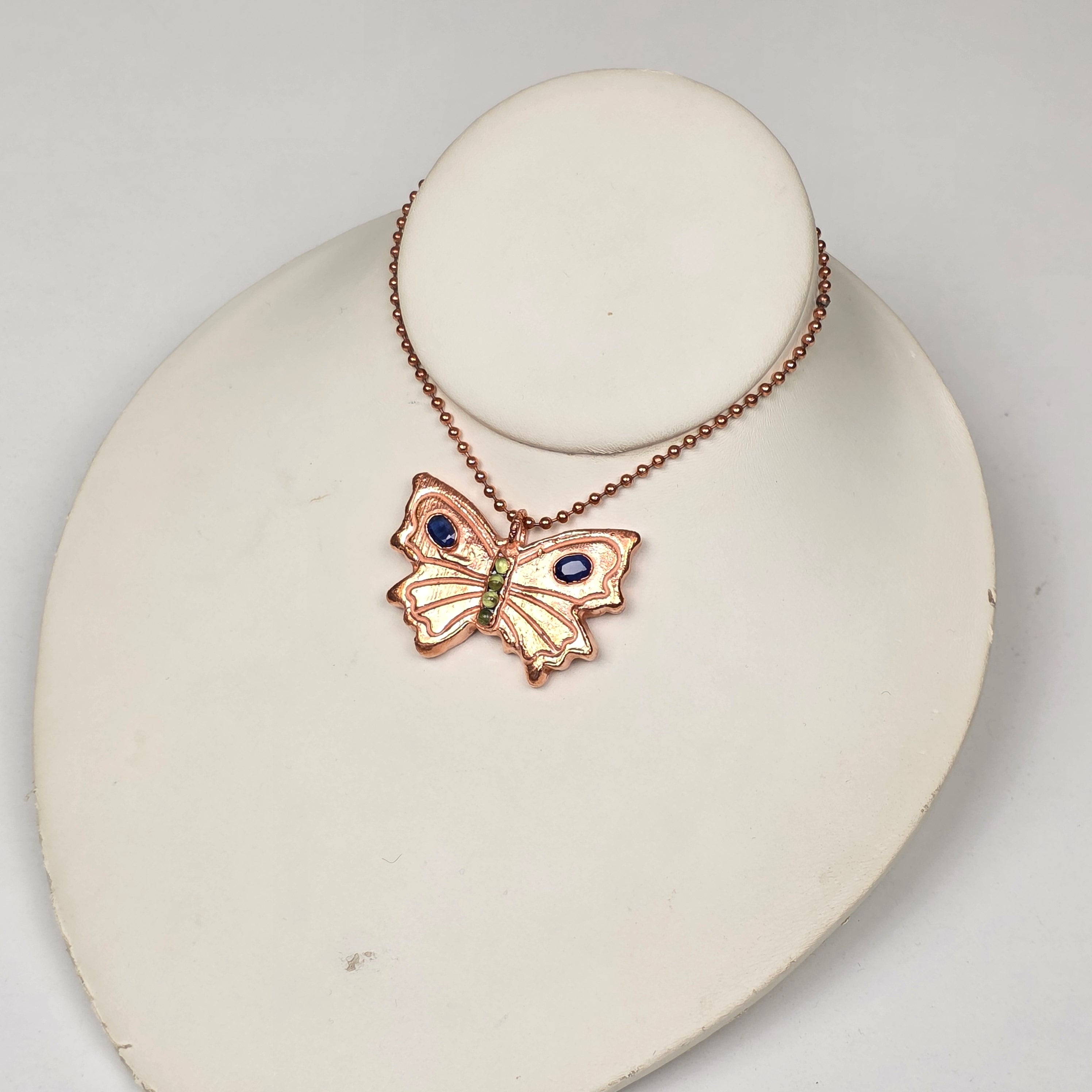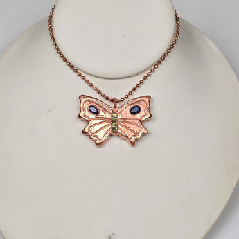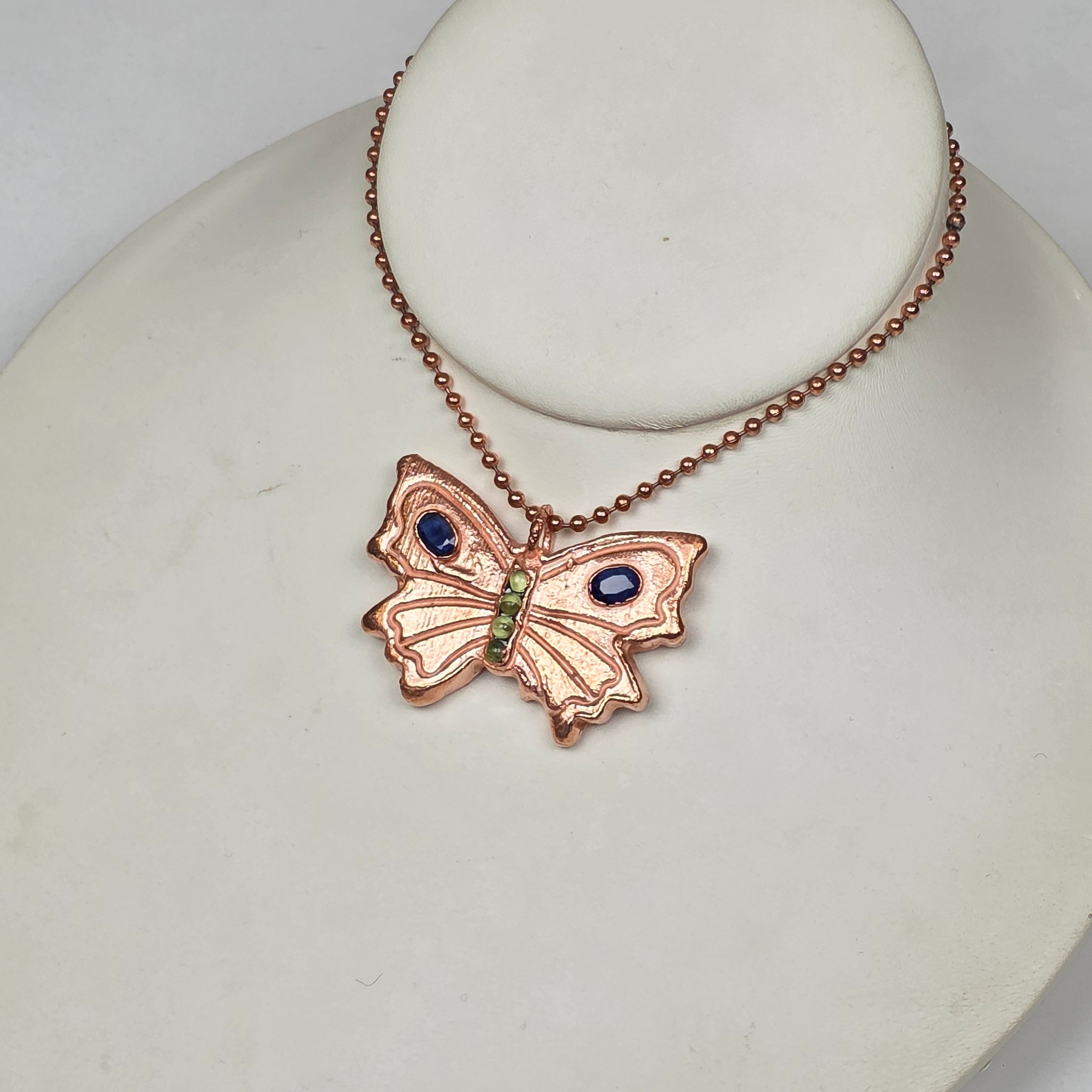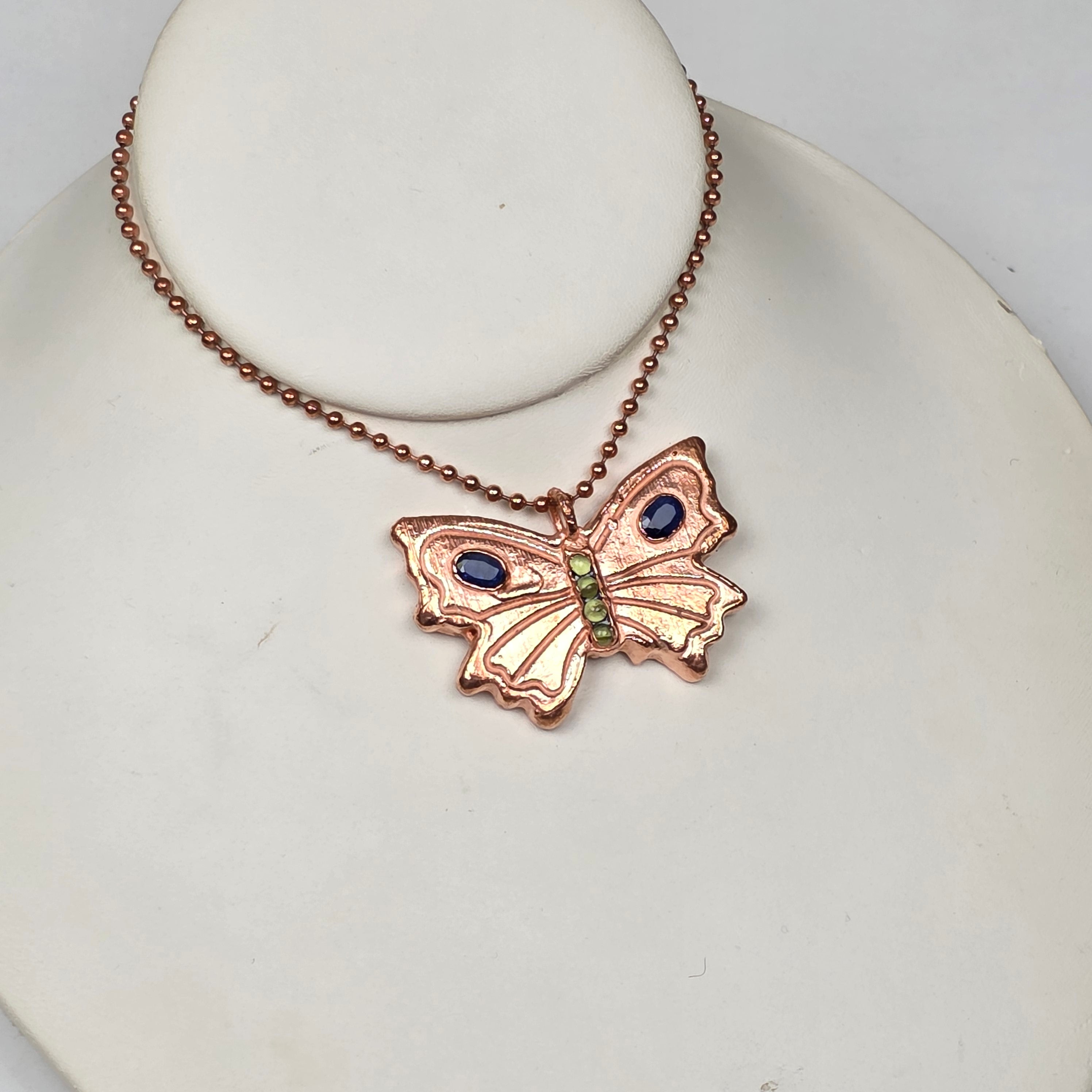 This unique pendant showcases a handcrafted clay butterfly, delicately copper-plated to highlight intricate textures and details. Embedded with genuine green apatite and kyanite stones, this piece combines earthy artistry with powerful crystal energies in a stunning, wearable form.