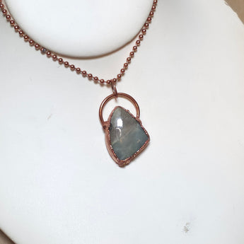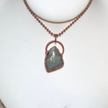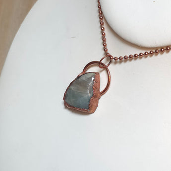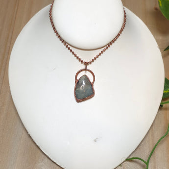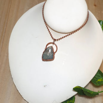 This serene pendant features a polished Aquamarine crystal in an organic, irregular shape, highlighted by a handcrafted copper electroplated halo that frames its natural beauty. The soft, watery blue tones of Aquamarine pair perfectly with the rustic warmth of copper, creating a piece that feels both soothing and elemental.