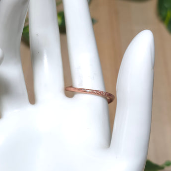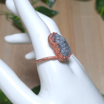 Set on a handcrafted asymmetrical copper band, this ring has a sculptural, modern feel that pairs beautifully with the raw elegance of the stone—perfect for those drawn to peaceful energy with a bit of edge.