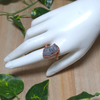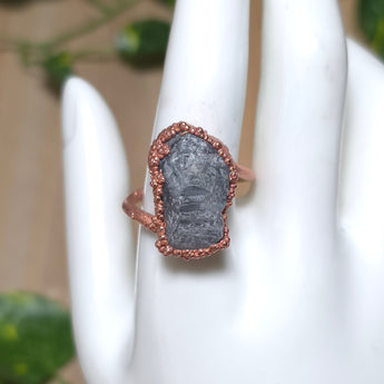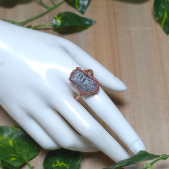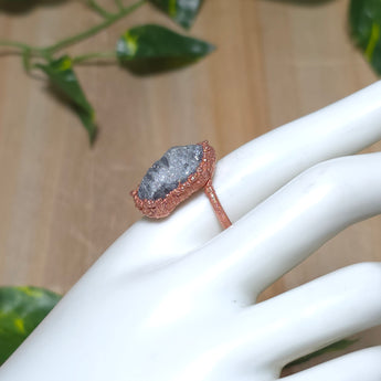 This dreamy ring features a raw Celestite crystal point, selected for its soft sky-blue glow and natural sparkle. The stone is electroplated in pure copper, with the metal flowing organically around the crystal’s form—preserving its raw, untouched beauty while creating a unique, wearable piece of crystal art.