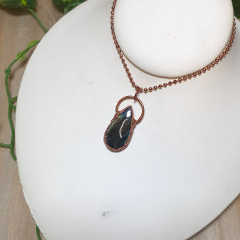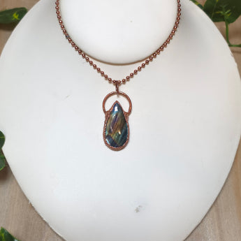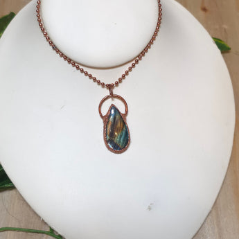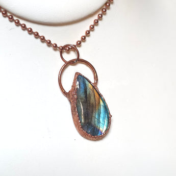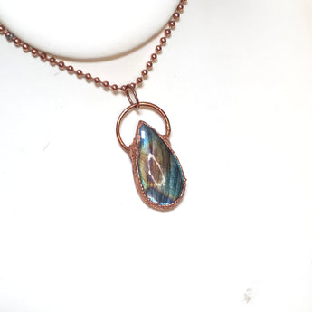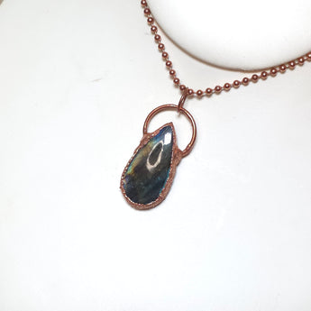 This enchanting pendant features a polished Labradorite crystal in a sleek teardrop shape, encased in a hand-formed copper electroplated halo. Flashes of blue, green, and gold shimmer from the stone’s surface, brought to life by the warmth of the rustic copper setting. Small but full of energy, this piece radiates both magic and strength.