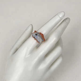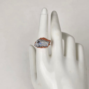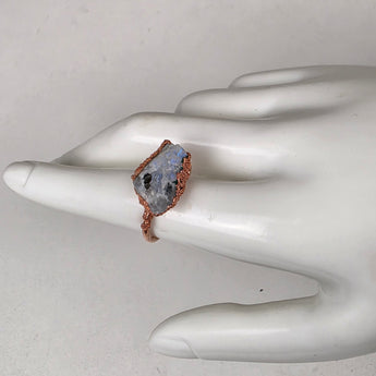 This enchanting ring features a raw Rainbow Moonstone crystal, carefully selected for its natural shimmer and flashes of blue. The stone is electroplated in pure copper, allowing the metal to flow organically around its form—preserving its raw, untamed beauty while creating a strong and artful setting.