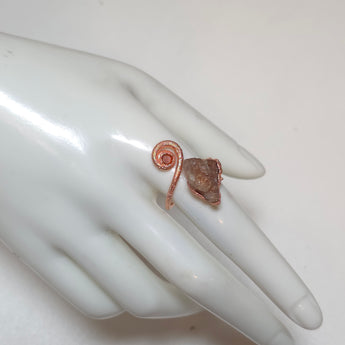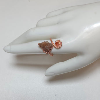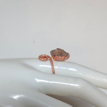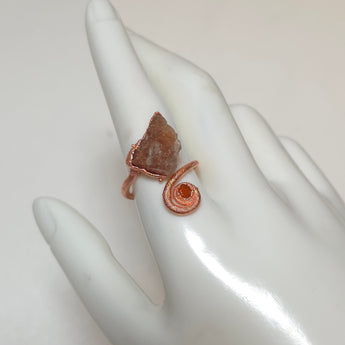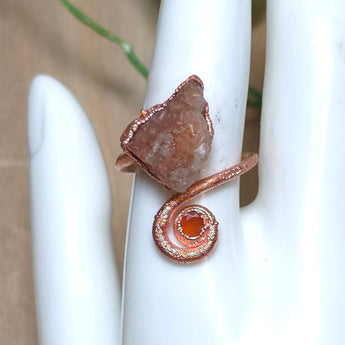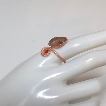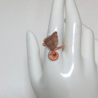 This unique ring combines the radiant energy of raw Sunstone with the organic elegance of a copper swirl, creating a design that is both mystical and bold. The raw Sunstone is electroplated in copper, preserving its natural shimmer, while the hand-formed copper swirl on the other end adds balance, movement, and artistic flair.
