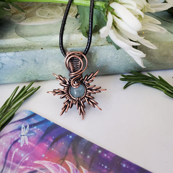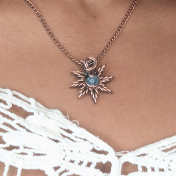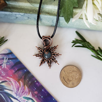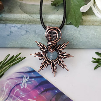 8mm round bead wrapped in copper that is oxidized and polished to an antique finish. This star designed piece utilizes the energy of the heart, third eye and crown chakras.