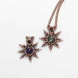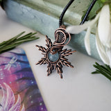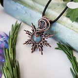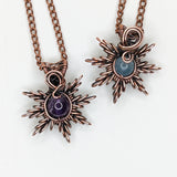 8mm round bead wrapped in copper that is oxidized and polished to an antique finish. This star designed piece utilizes the energy of the heart, third eye and crown chakras.