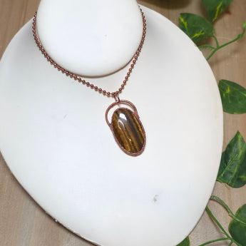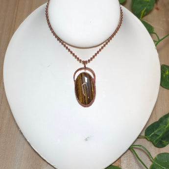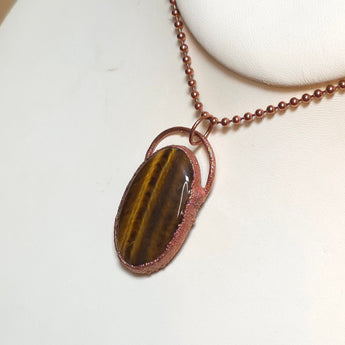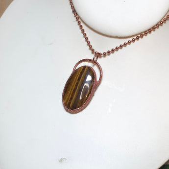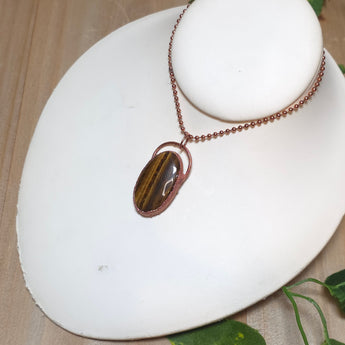 This bold and earthy pendant features a polished Tiger’s Eye crystal in a classic oval shape, framed with a hand-formed copper electroplated halo. The stone’s natural golden-brown chatoyancy (light-reflective shimmer) catches the eye, while the rustic copper finish enhances its grounding energy and vintage charm.